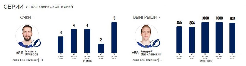 И в этой связи стоит отметить еще одного российского хоккеиста «Тампы», вратаря Андрея Василевского, который отразил 39 бросков из 49. На изображении ниже показаны очки Кучерова и процент отраженных бросков Василевского в последних 5 матчах. У Андрея 2 шатаута и высокие 97%. В этой игре он был очень близок к еще одному шатауту, но меньше чем за 2 минуты до финальной сирены Лукас Седлак все-таки переиграл кипера «Тампы».