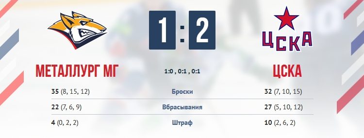 Результат матча Металлург Мг — ЦСКА 1:2 (1:0, 0:1, 0:1)