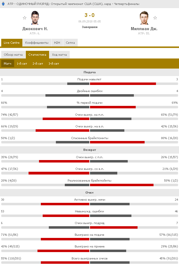 Новак Джокович играл агрессивнее своего оппонента. Именно серб, несмотря на все усилия соперника, контролировал ход игры. Поэтому логично, что на счету Ноле было больше виннерсов и не вынужденных ошибок. При этом нельзя не сказать, что оба ошибались намного чаще, чем активно выигрывали мячи. И у Джоковича, и у Миллмана баланс в этом плане за -20.