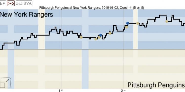 В первом периоде было преимущество хозяев площадки по броскам в створ 12-5. В принципе «Рейнджерс» выиграл по этому компоненту и в целом на протяжении всей игры действовал активнее в атаке, что прекрасно видно на графике показателя Корси, представленном ниже.