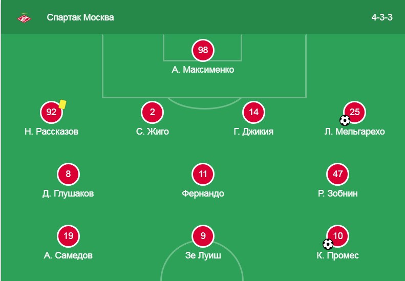 «Спартак» вышел на игру тактикой 4-3-3. Самедов, Зе Луиш и Промес были на острие атаки. И в этом была небольшая неожиданность, так как Самедов обычно играл под нападающими. Зе Луиш и Промес в последнее время набрали отличную форму и их тандем не раз доказывал свою эффективность в атаке в этом чемпионате.