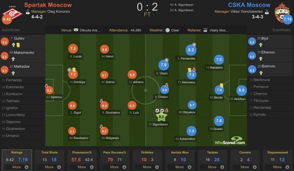 Но лучшими по оценкам в составе ЦСКА стали Сигурдссон, Марио Фернандес — по 8.2, Влашич — 7.9. У «Спартака» лишь два футболиста получили баллы больше 7: Лукас и Джикия.