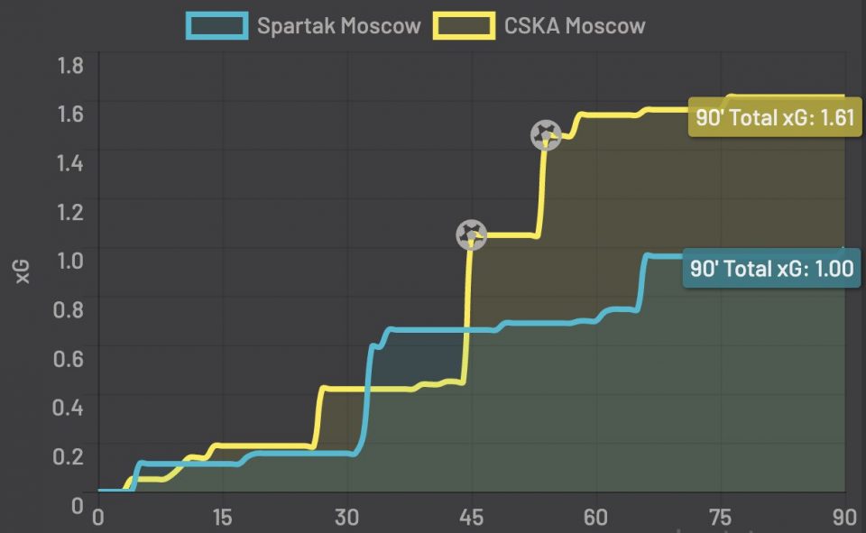 При этом команды взяли высокий темп с первых минут. Только есть одно «но» — игроки ЦСКА гораздо лучше готовы физически. » Спартака» в первом тайме были весьма неплохие шансы открыть счет и они должны были это делать. Отлично эта картина видна на графике потенциальных голов xG. В первом тайме этот показатель у хозяев поля был выше. Второй тайм, правда, остался за армейцами- в итоге xG у них получился выше. Но «Спартак» на один гол наиграл точно.