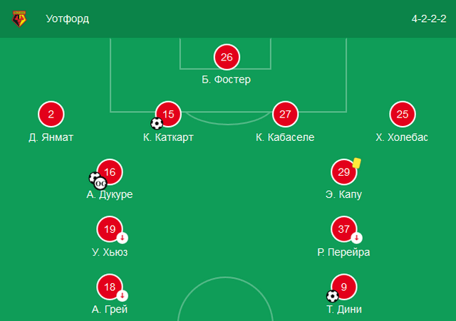 Хозяйский клуб провел поединок по схеме 4-2-2-2. На острие атаки действовали Дини и Грей, по краям расположились Перейра и Хьюз, а в центре полузащиты поединок провели Дукуре, забивший гол, и Капу.