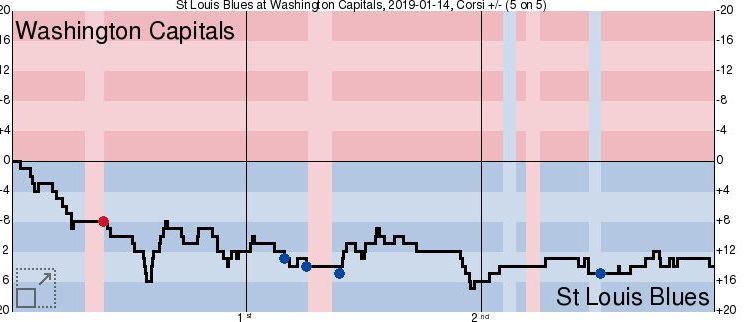 Затем игра стала выравниваться и даже гости начали забирать инициативу. Уже в первом периоде «блюзмены» превзошли соперника по показателю Корси, за счет того, что были активнее в атаке. Но при этом «Капс» атаковали гораздо опаснее.
