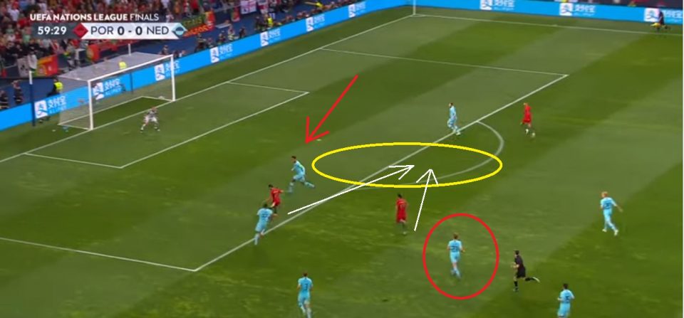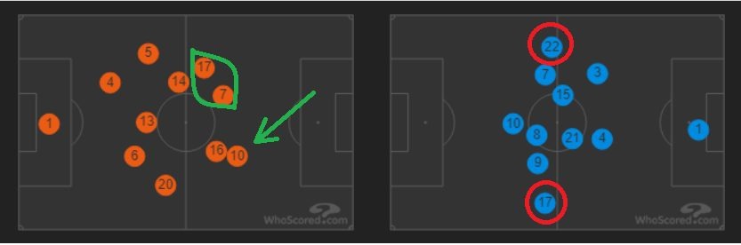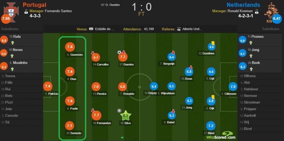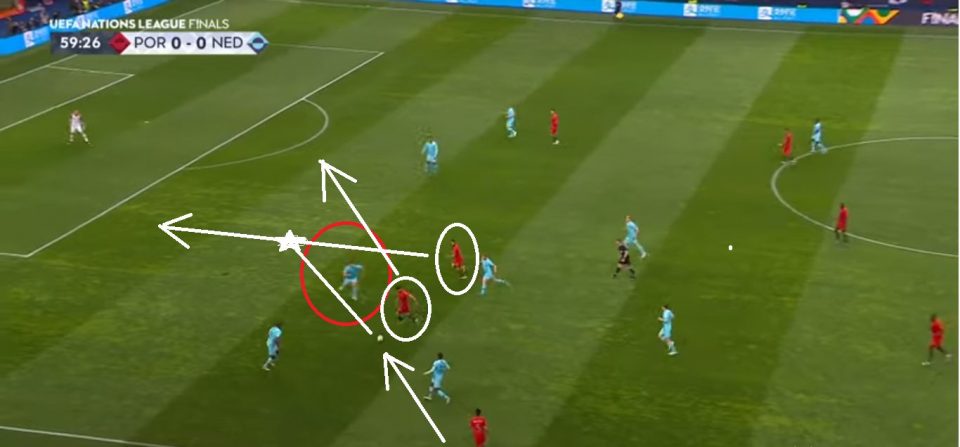 Если посмотреть на карту расположение футболистов, увидим, кроме трех португальских центральных полузащитников, совершенно другое: вдали от центра был Криштиану Роналду, который был расположен высоко и чуть левее. На этой же стороне, только глубже — Гонсало Гуэдеш, который также исполнял роль, как узкий широкий полузащитник. На противоположной стороне — Бернардо Сильва.