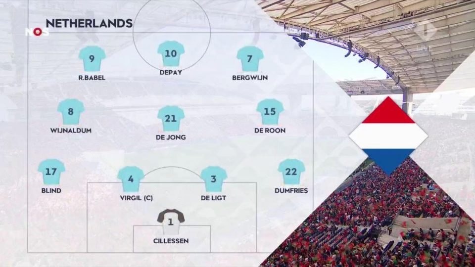Что касается Нидерландов, позиции игроков демонстрируют такое: Вейналдум играл выше де Йонга и Де Рона, а крайние защитники активно поддерживали фланговых нападающих.