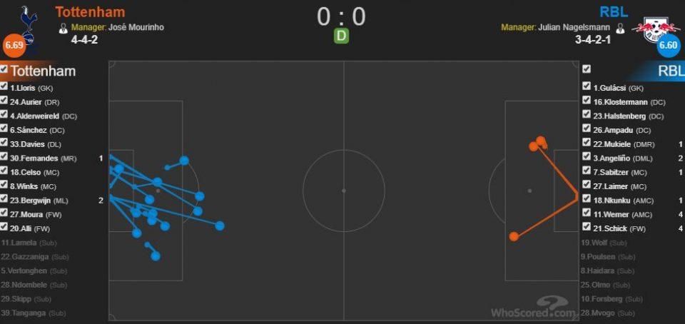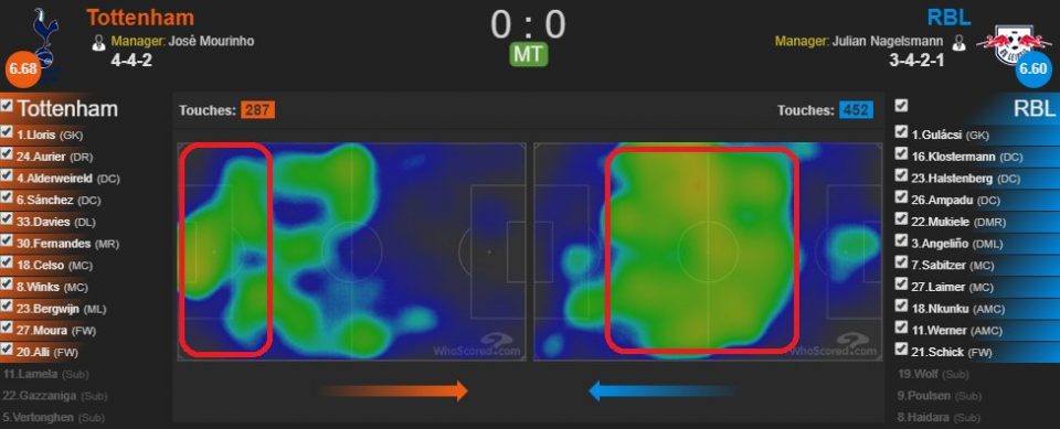 Футболисты «Лейпцига» доминировали на протяжении всего первого тайма. Обратите внимание на тепловую карту.