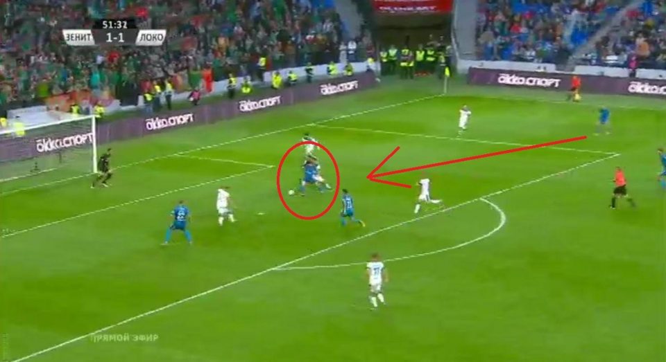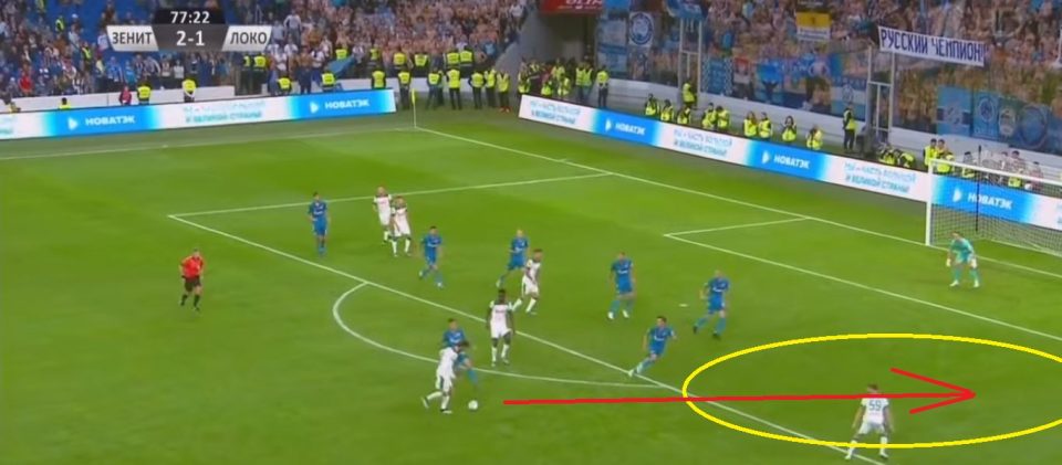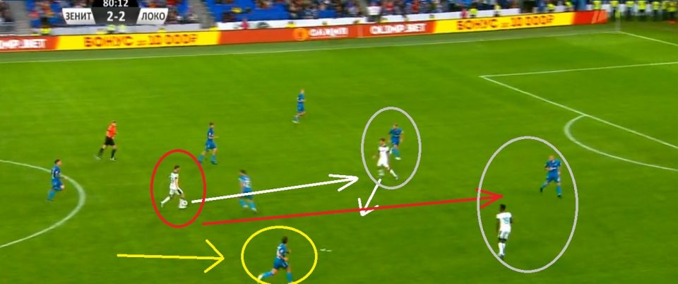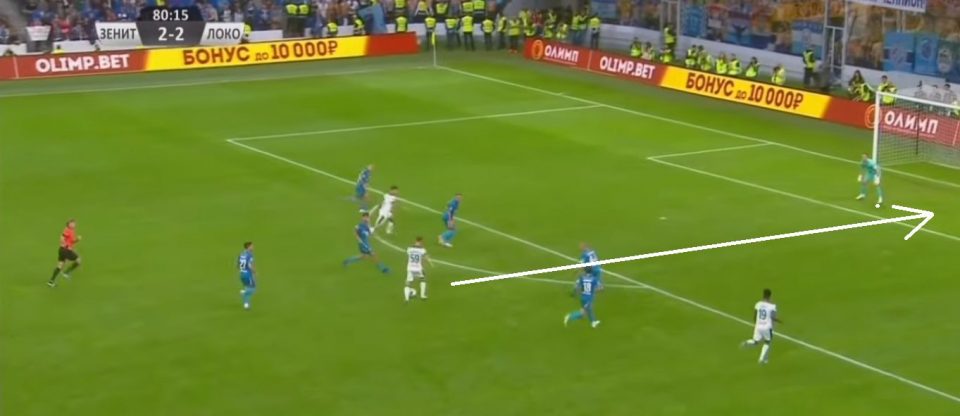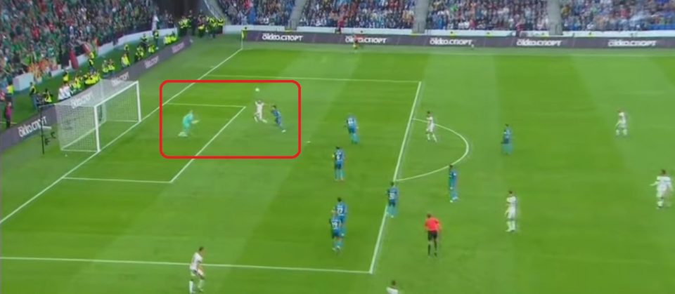 Через минуту в центре поля Миранчук играет в простую «стенку» с партнером. Его никто не встречает 2.5 секунды, так как игроки «Зенита» не успели перестроиться в защите (Смолов увел Ивановича, а Ракицкий прикрывал левый фланг, где находился Эдер. Левый защитник «Зенита» не был на своей позиции, при атаке «железнодорожников») В итоге, он снова попадает точно в угол ворот.
