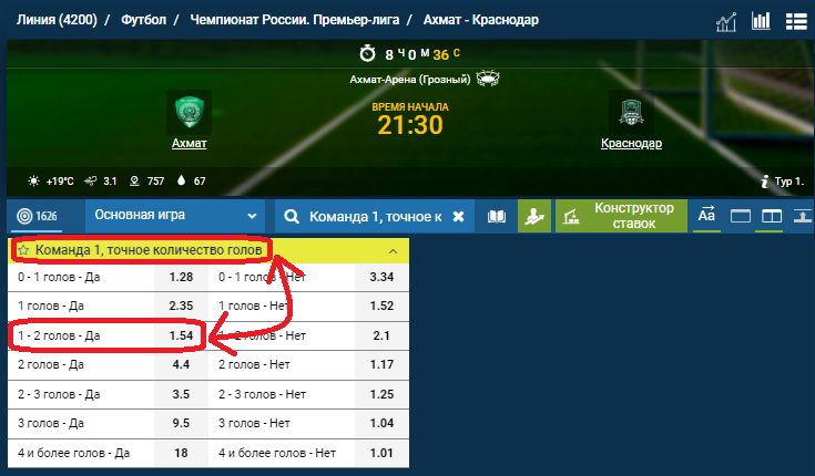 Команда «Ахмат» вполне способна распечатать ворота «Краснодара». Коэффициент на событие «Ахмат забьет гол: да» около 1.54. Однако, есть практически аналогичная ставка первой, но она находится только на двух букмекерских конторах.
