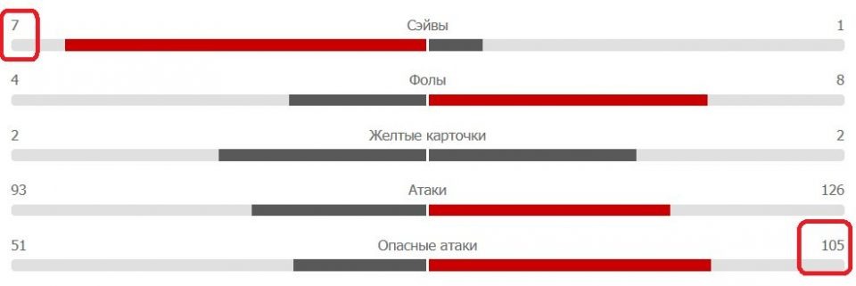 Сейвы: 7-1. Опасные атаки: 105 у «красно-белых»! Это в два раза больше, чем у «Мариуполя». За всю игру подопечные Александра Бабича провели две перспективные атаки (на 35-й и 74-й минутах). Первая закончилась прострелом в штрафную площадь, вторая — ударом по воротам.