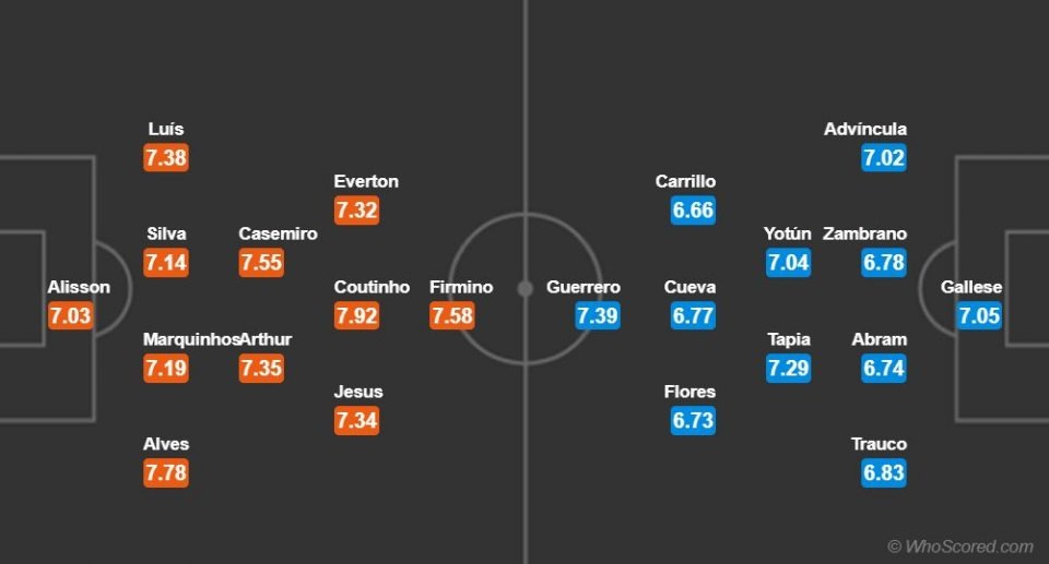 Раньше много было сказано хорошего про «избранных». Команда дошла до финала без единого поражения и пропущенного мяча (сухая серия Алиссона составляет 9 матчей). Кроме этого, сборная по составу, в отличии от перуанцев, выглядит намного сильнее. Посмотрите на фамилии игроков Бразилии, а теперь на Перу. Разница уже видна в подборе игроков. Также обратите внимание на среднюю оценку команд в текущем турнире — 7.4 против 6.9. Разница в цифрах — 0.5.