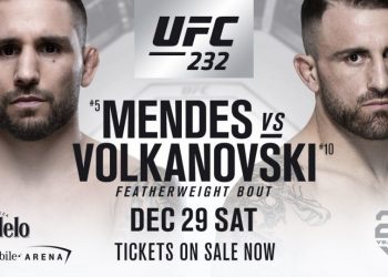 30 декабря на крупном турнире UFC 232 снова в октагоне появится полулегковес Чед Мендес, который отбыл двухгодичную дисквалификацию и уже успел выиграть один поединок. Соперником Чеда станет австралиец с македонскими корнями Алекс Волкановски.
