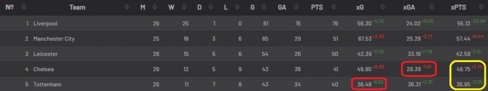 - «Челси» за 26 туров пропустил 36 голов, xGA — 28,39. Это означает, что в некоторых эпизодах, матчах соперники забивали голы, где, в принципе, их не должно быть, ведь как показывает understat.com — -7.61. Исходя этих цифр, среди лучших оборон в АПЛ подопечные Лемпарданаходится на 4 месте, а их атака — на 3 строчке.