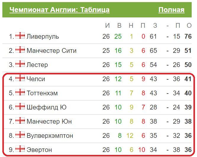 Как уже всем известно, «Манчестер Сити» может быть дисквалифицирован от участия в еврокубках на два сезона. Поэтому, в текущем сезоне, ВОЗМОЖНО, 5 место АПЛ будет путевкой в Лигу чемпионов. На 4-5 позиции претендуют сразу 6 команд, в том числе «Челси» и «Тоттенхэм».