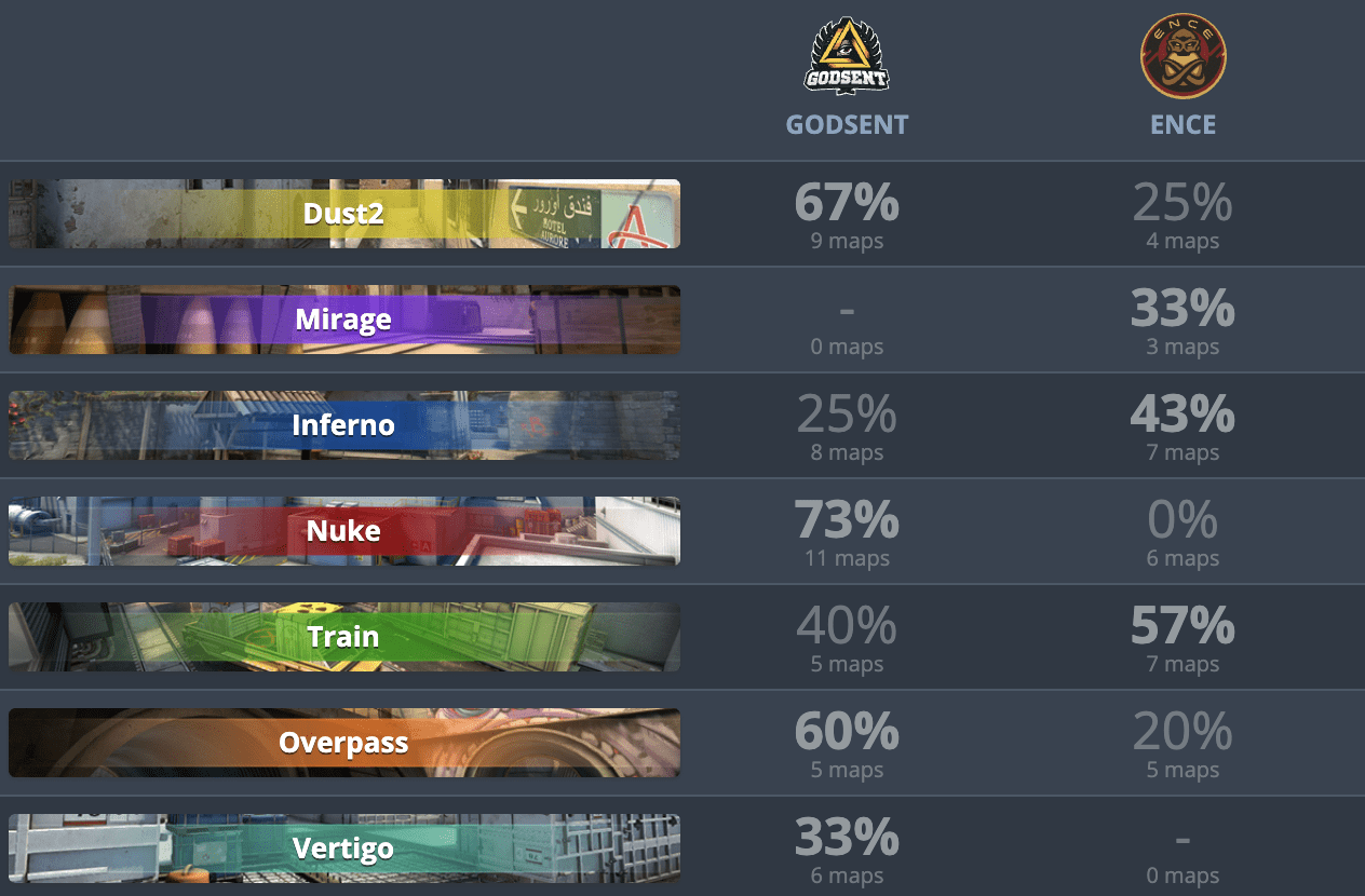 Но естественно гарантии нет, что именно на одной из этих локаций пройдет матч. Может сложиться так, что поединок пройдет на одной из любимых карт ENCE, например, Train. Но по-большому счету лишь на Train у ENCE есть преимущество.