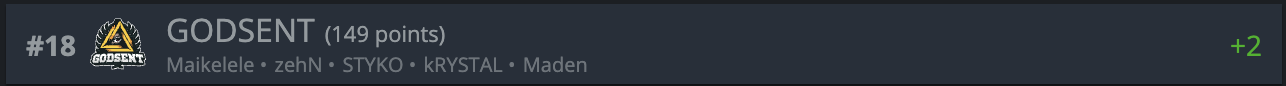 Шведская кибеспортивная команда занимает 18-е место в мировом рейтинге. Движение в рейтинге положительное, они поднялись на 2 позиции.