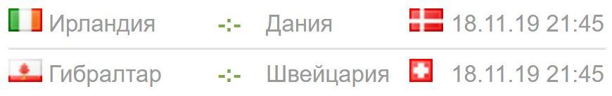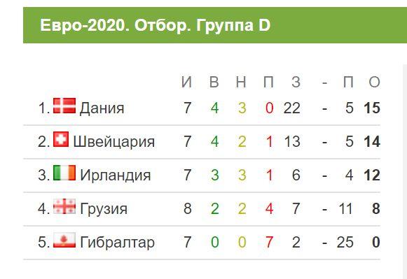 В группе D осталось 2 игры (все матчи на изображении). С большой долей вероятности, Швейцария обыграет Гибралтар и займет 1 или 2 строчку. Таким образом, основное внимание будет уделено противостоянию между ирландцами и датчанами.