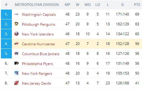 До выше указанных неудач у «Каролины» было 3 победы подряд. В Столичном дивизионе очень напряженная турнирная ситуация. «Каролина» на границе зоны плей-офф с 56 очками, при этом у двух конкурентов, идущих ниже, тоже по 56 очков.