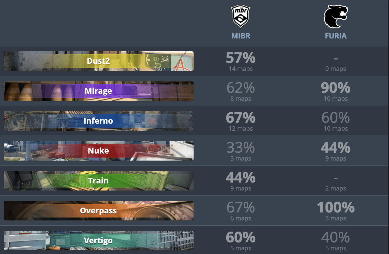 FURIA вероятно забанит Dust2, тем самым они не позволят MIBR сыграть на их лучшей карте. Причем у самой FURIA нет поединков на этой карте в последние три месяца. В качестве пика они предпочти бы Mirage. Здесь у них невероятная статистика: 90% побед на десяти сыгранных картах. Они также имеют хорошие результаты на Overpass и Inferno. Vertigo и Nuke — довольно слабые карты — 40% и 44%. На Train они вообще не играли в последние 3 месяца.