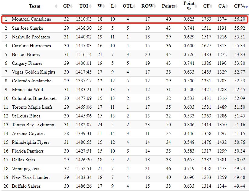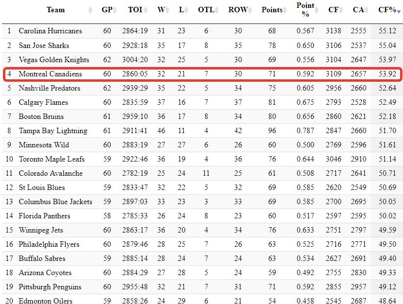 А если рассматривать только домашние матчи, то по ним «Канадиенс» вообще лидер по Корси, с высоким значением 56,2%.