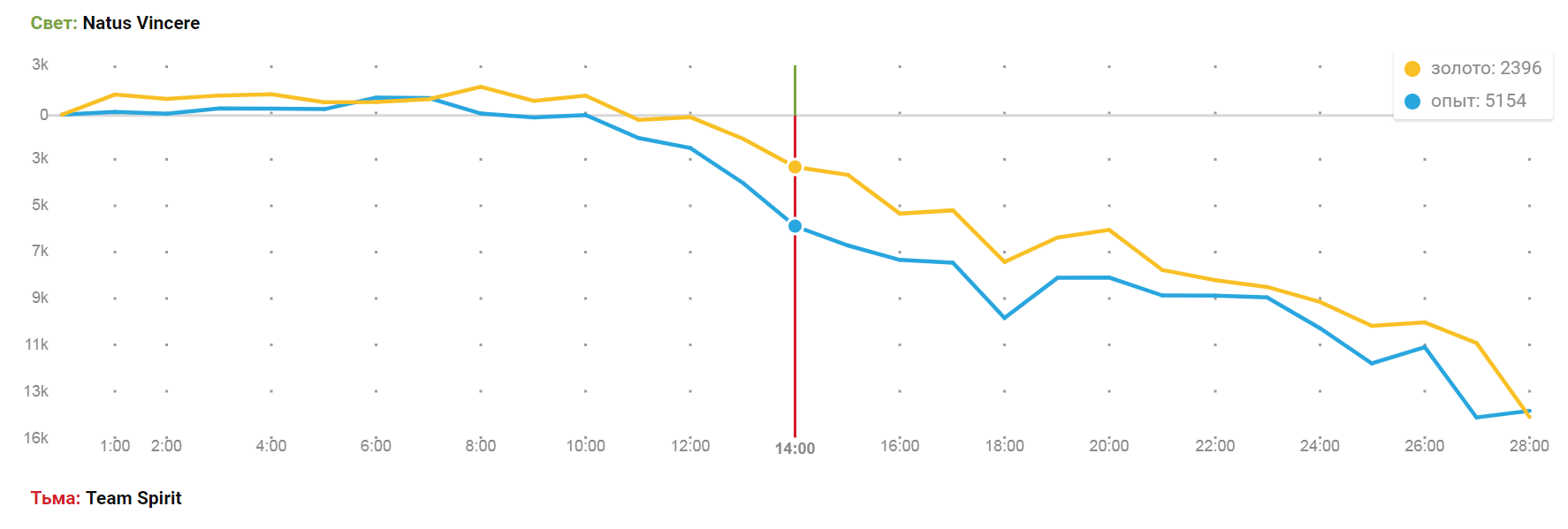 Киберспортивные команды встречаются не в первый раз. Последняя встреча была в пользу российского коллектива. К тому же они играли такими же составами, что и будут 28 апреля! Тогда первая карта была полностью в пользу клуба из России. Обратите внимание на изображение, где показано, что уже с 14 минуты был перевес в 6 тысяч золота в пользу Team Spirit.