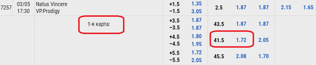 Букмекерская контора Parimatch выставляет практически аналогичное событие 1-я карта: ТБ(41.5).