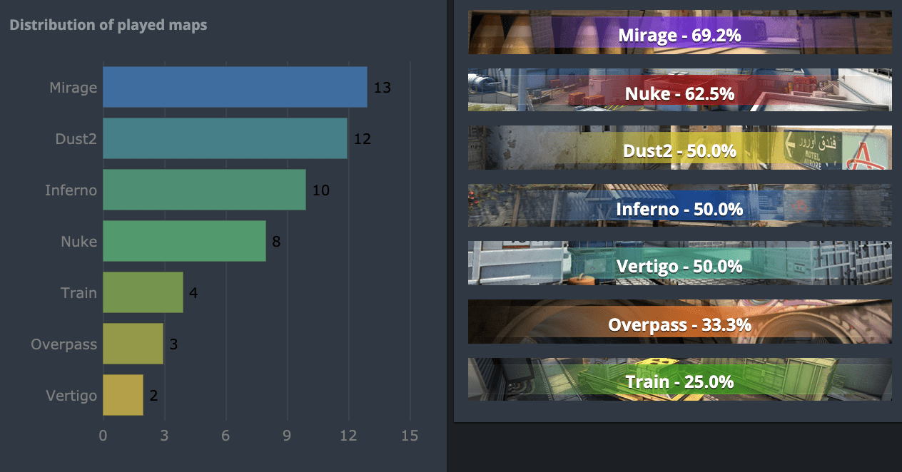 Complexity вероятно первым баном уберут Vertigo, которая является самой сильной картой NiP. Американцы чувствуют себя хорошо на Nuke и Mirage, но в целом их маппул неубедителен. На Train и Overpass у них винрейт около 30%, а на большинстве других карт не превышают 50%.