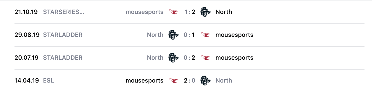 Между 14 апреля 2019 года и 21 октября 2019 года между командами сыграно 8 карт. Из них North выиграл только две и Mousesports — 6.