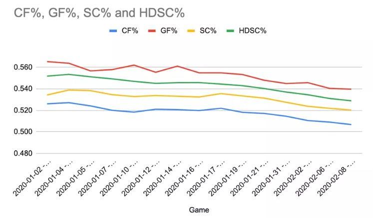 Тем не менее травмы бесследно не проходят и с 1-го января у «Питтсбурга» наметилось снижение важных показателей атаки: Корси, броски из опасных зон, броски из сверх опасных зон, разница заброшенных и пропущенных шайб.