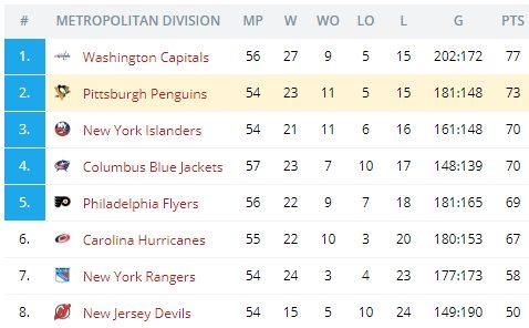«Пингвинз» отстает от лидера дивизиона на 4 очка, но при этом имеет 2 игры в запасе относительно Капс. Так что, по сути «Вашингтон» и «Питтсбург» идут в одном графике набора очков.