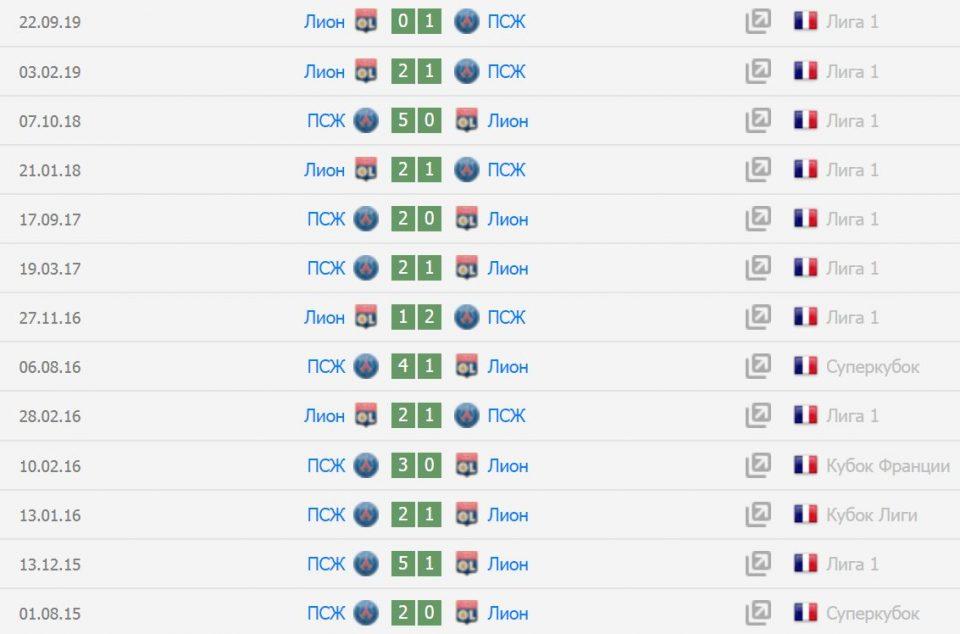 - на выезде «Лион» не может забыть 2 гола «парижанам» в 11 матчах подряд (обратите внимание на изображение), то есть данный исход прошел 6 раз и 5 возвратов;