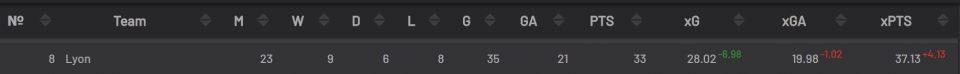 Обратите внимание на показатель G и xG. 35 голов и 28.02 ожидаемых забитых мячей, то есть почти -7,00. Это означает, что в некоторых поединках футболисты Руди Гарсии забивали с таких позиций, где шанс, что будет гол = минимальный.