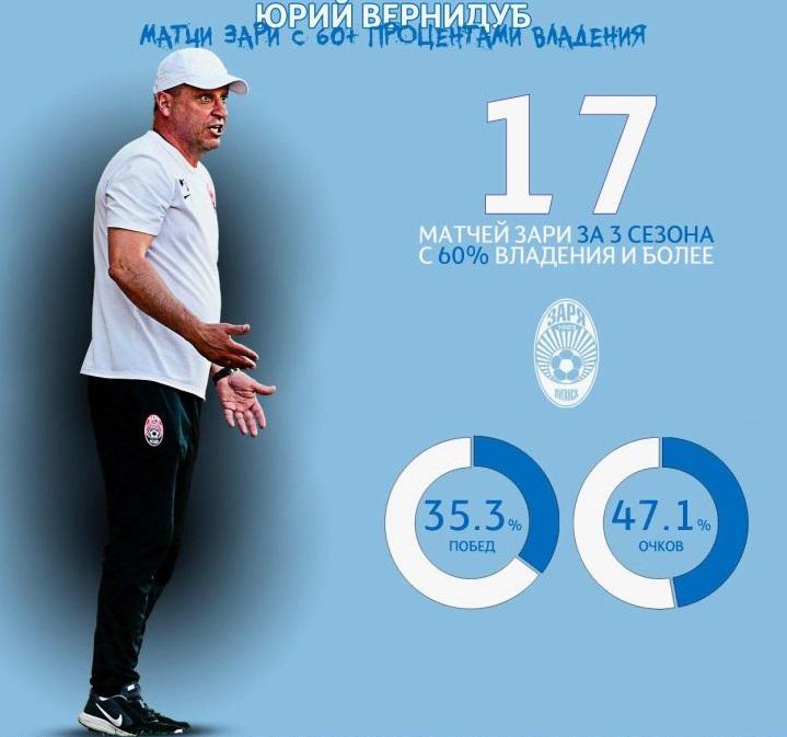 Следующий нюанс ставки — стиль игры хозяев. Главный тренер проповедует игру от обороны, вторым номером (!), ведь если посмотреть на матчи «Зари» (Луганск) за три предыдущих сезона с более 60% владения мячом, то 35,3% побед и чуть меньше 50% набранных баллов!