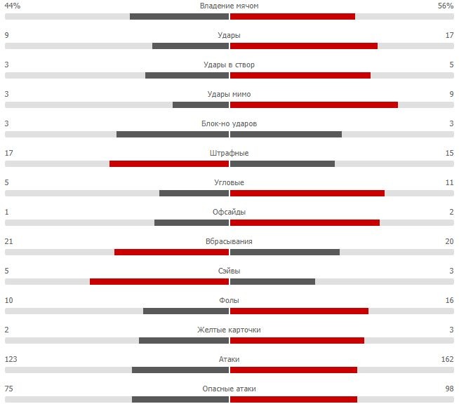 По количествам ударов, атак, владению мячом. Все это — цифры, а по опасным моментам — равенство. Основные эпизоды матча можете посмотреть здесь.