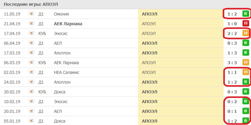 2. Статистика клуба на выезде в 2019 году: 8 побед, 3 ничьи, 1 поражение; в 8 играх (из 12) команда пропускала минимум 1 гол; 7 матчей (выделены красным цветом) «АПОЭЛ» забивал 1-2 гола.