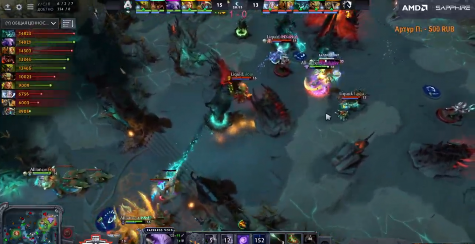 Пример последней карты с Ликвидами. Обратите внимание где находился герой Войд с аегисом. Рядом с ним 3 вражеских героя. Nikobaby идет до конца за miCKe и погибает дважды! Тогда, как видите на изображении, у Alliance не было большого преимущества. Подобные ошибки были и предыдущем матче.