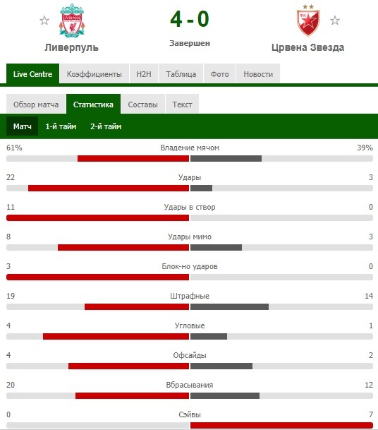 Прошлый поединок между командами наглядно продемонстрировал различие в классе. «Ливерпуль», как и положено хозяину, с первых минут взял мяч под свой контроль и раз за разом заставлял напрягаться оборону «красно-белых». Успевать за скоростными атаками у сербского коллектива не получалось, что и переросло в 5 жёлтых карточек для них. В первом тайме «скаузеры» дважды поразили ворота соперника и сделали это столько же раз и во втором. А вот сербы за весь матч нанесли лишь 3 удара в сторону ворот и ни одного в створ.