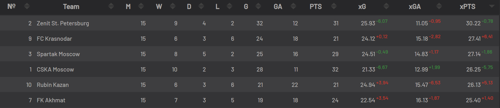 В чемпионате России «армейцы», имея в активе 32 балла за 15 туров, занимают первое место. Многие прогнозисты и эксперты обращают внимание на количество пропущенных мячей ЦСКА, ведь 11 голов — это лучший показатель в РФПЛ. Однако нужно отметить другие нюансы. Если рассматривать показатель xPTS (ожидаемое количество полученных очков), то «красно-синие» должны занимать не 1 строчку, а 4-5 позицию!