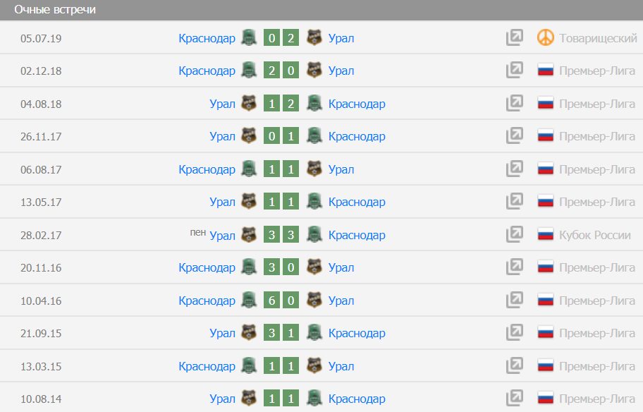 Обратите внимание! За всю историю противостояния «Краснодар» в каждой выездной встрече распечатывал ворота «Урала» по 1-2 раза. Только однажды удалось забыть 3 мяча. Статистика результатов приведена в таблице.