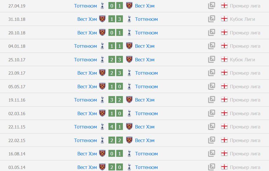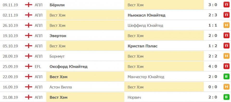 Обратите внимание, в основном, команда забивала 1 — 2 гола. Такая ставка прошла 15 раз за последние 21 матча, а также 11 раз в 15 встречах на поле «Вест Хэма».