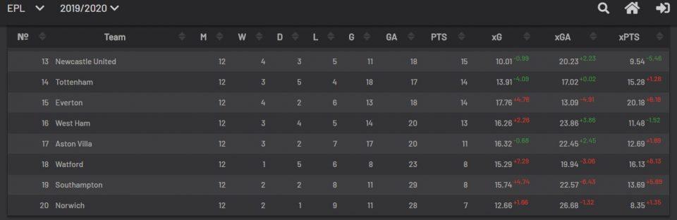 Также стоит упомянуть за xG — 13.91, почти 14, когда всего голов в АПЛ — 18! Этот xG один из наихудший во внутреннем первенстве — 17 место по этому показателю! По xGА — 10 сточка.