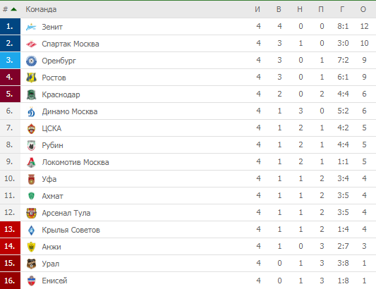 «Зенит» продолжает набирать очки. В 4 матчах команда из Санкт-Петербурга команда неизменно побеждает. В матче четвертого тура был повержен «Урал» со счетом 4:1.
