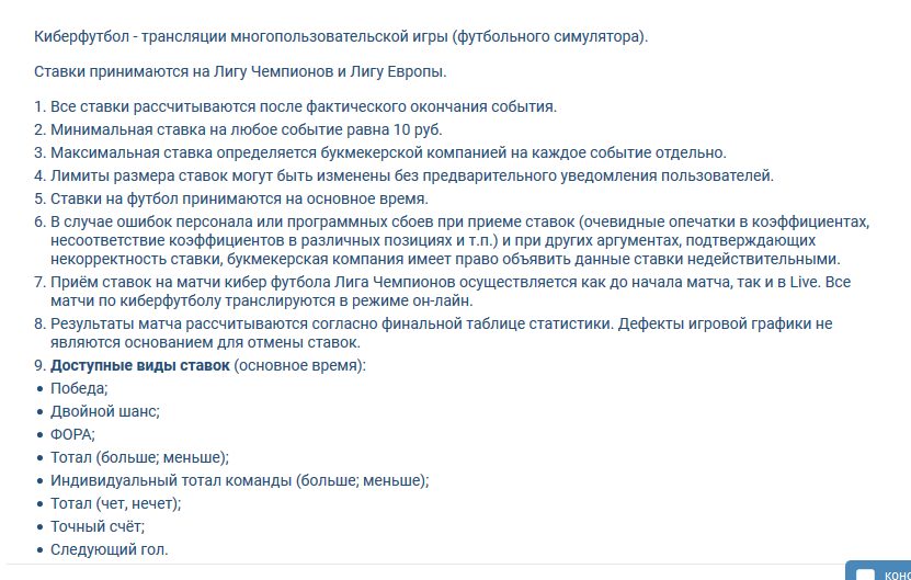У каждого букмекера есть собственная платформа, которая отвечает за перемещение виртуальных футболистов по полю и конечный результат. В связи с этим правила игры могут отличаться, а значит перед заключением пари с ними необходимо внимательно ознакомится. Во всех букмекерских конторах есть следующие пункты: