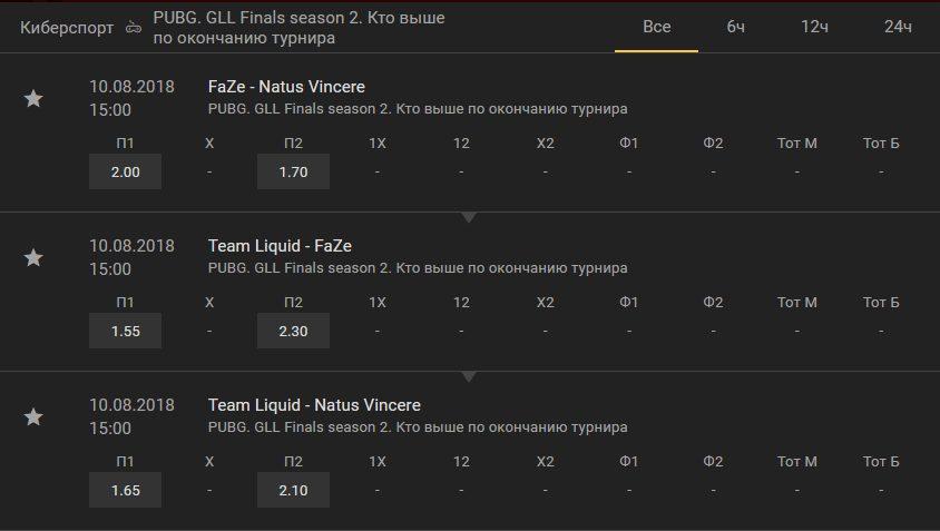 PUBG — молодая кибердисциплина, поэтому линия для ставок скудная. Помимо выбора победителя, букмекер предлагает такие исходы: