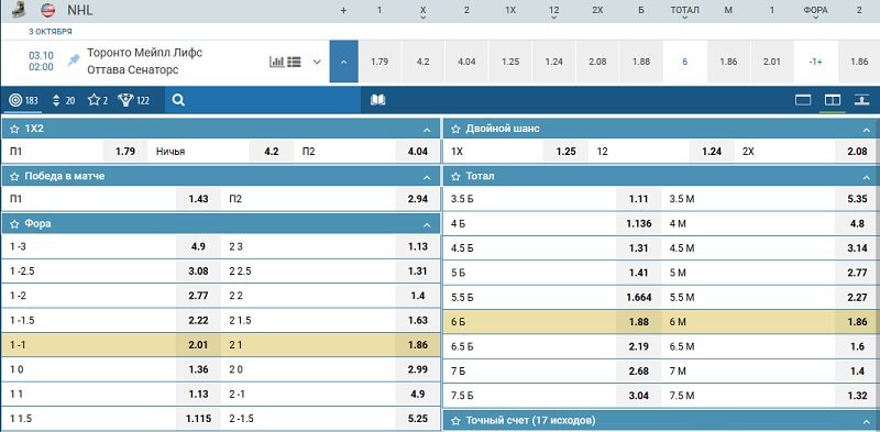 Букмекерские конторы предлагают широкую роспись на события из мира сильнейшей хоккейной лиги. У бетторов есть возможность заключить пари на: