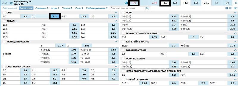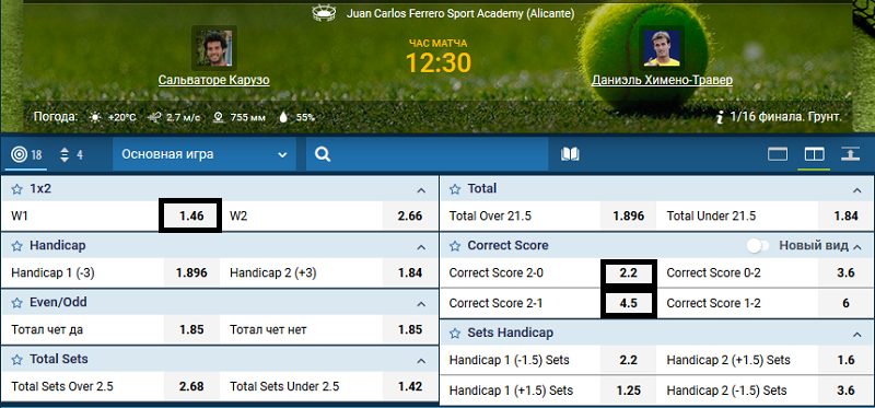 Если игрок заключит одновременно пари на победу Карузо со счетом 2-0 и 2-1, на которые выставлены котировки 2.2 и 4.5 соответственно, то итоговый коэффициент составит 1.48: