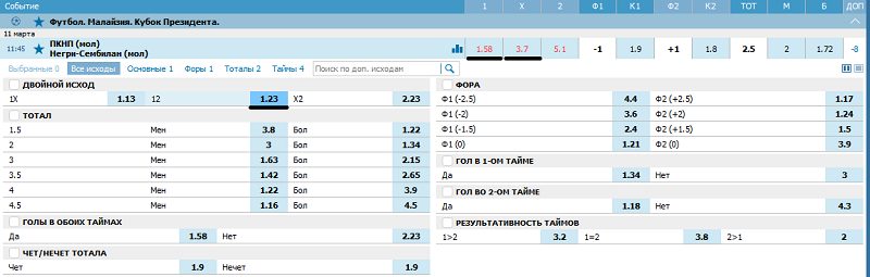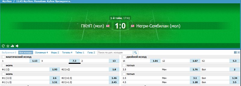 Изменения котировок по ходу встречи Для лучшего восприятия разберем матч из Кубка Малайзии между молодежными командами ПКНП и «Негри-Сембилайн». Общая сумма пари на матч 10 000 рублей.