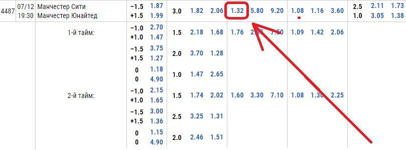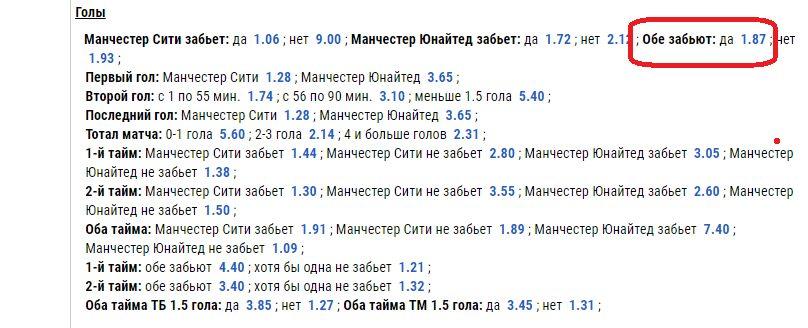 Одиннадцатая игра для стратегии BTTS (Both teams to score): «Манчестер Сити» — «Манчестер Юнайтед». Букмекеры с большим перевесом отдают предпочтение хозяевам, где их победа оценивается с коэффициентом 1.32 . По правилам данной стратегии: «Если БК выставляет коэффициент ниже 1.3 на победу одну из команд, то нельзя рассматривать такие матчи». В нашем случае, число 1.32 .