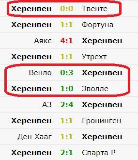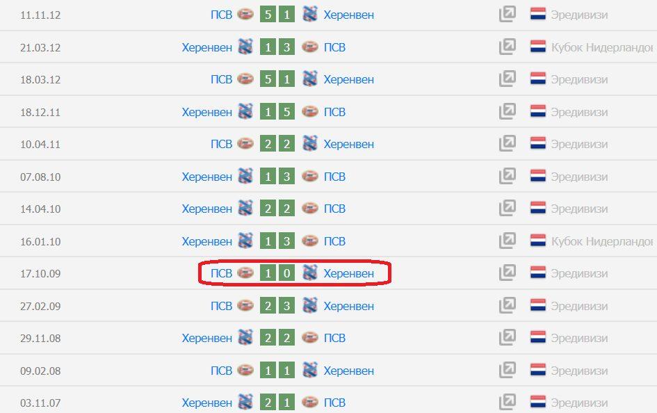 По правилам стратегии BTTS необходимо рассматривать последние 10 матчей клубов только в 1 соревновании. Поэтому, выбираем чемпионат Нидерландов. У «красно-белых» ставка «Обе забьют» прошла 6 раз из 10 (60%), у «Херенвена» — 7 из 10 (70%).